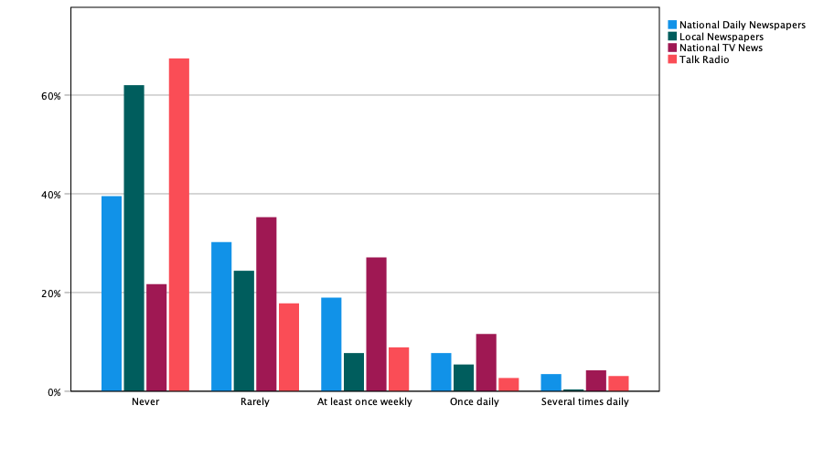 The study of media consumption habits among college students in the state of Connecticut confirms this trend. In a study of 258 students enrolled in program in all the public institutions of higher education in CT (the four universities of the state system, the University of Connecticut and the 12 community colleges), the vast majority of students stated that they never or rarely read national and regional newspapers or listens to radio shows. The number of students who watch TV is higher, although, again, just 15% do it daily.