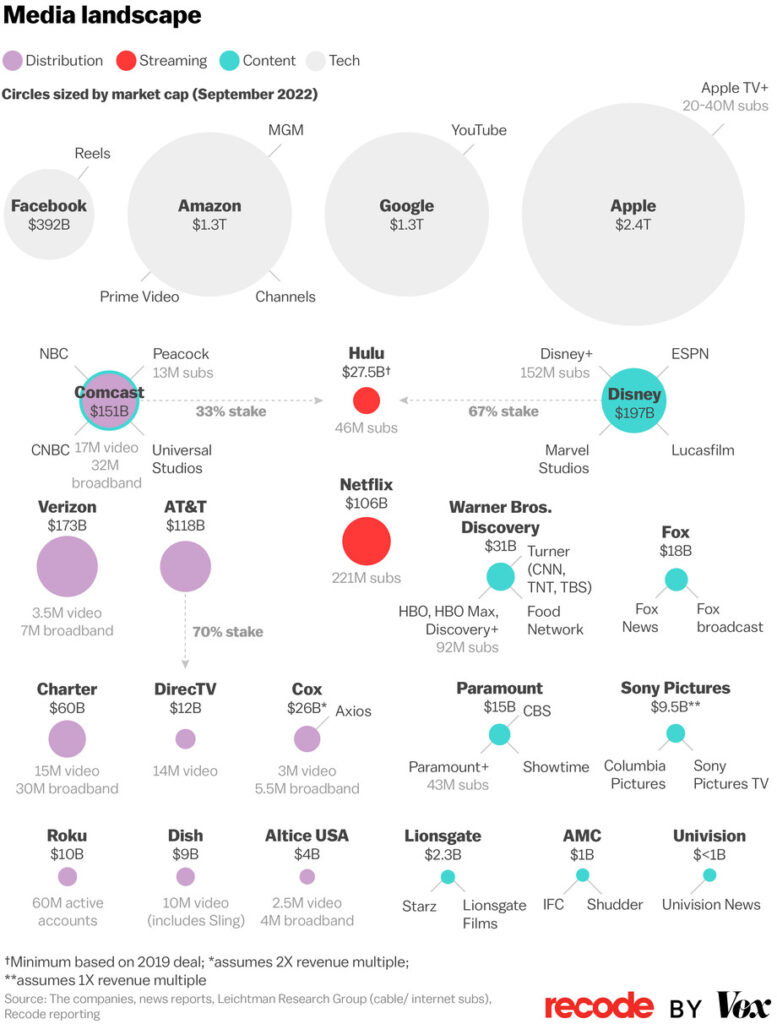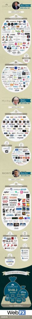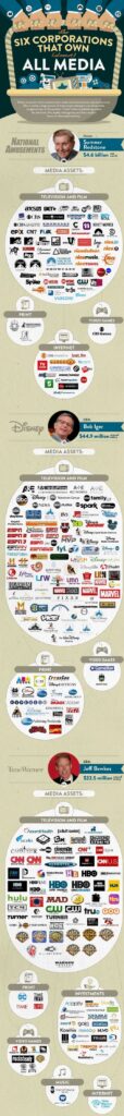 The word “oligopoly” derivates Greek ὀλίγοι (olígoi, “few”) and πωλέω (pōléō, “to sell”). It describes a system where only a few have the control of the means of production and distribution of a particular good or service (the monopoly would be the system where only ONE actor owns the market). The word perfectly fits the media market that results from the process of convergence: An economic structure in which a few, very large, very powerful, and very rich owners control an industry or series of related industries. The result of media economic convergence is, logically, a more centralized structure happening at the time of decentralization. The result of the convergence process is the consolidation of large companies merging with each other or absorbing other companies, forming even bigger companies (see the map of the 6 largest media companies).