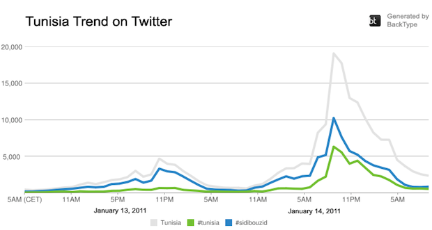 Social media open a new frontier for political activism. The potential became clear during the so-called Arab Spring in the early 2010s. The protest originated in Tunisia on December 17th, 2010, where a man named Mohamed Bouazizi set himself on fire in the remote region of Sidi Bouzid, in the center of the country. The actual reason was that he was denied a permit to work as a street vendor. The incident sparked a massive popular reaction. Twitter became the most effective tool for the protesters to communicate to each other and organize the subversive actions. As a matter of fact, the unrests became known as “the Twitter Revolution”. The graphic shows the activity in Twitter during the first weeks of 2011: